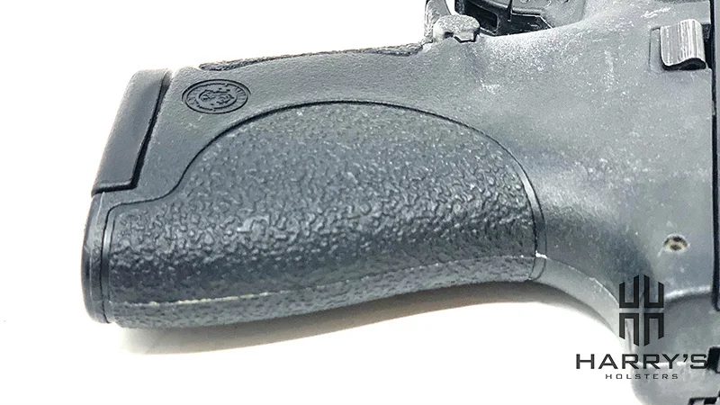 There’s texturing on the Smith and Wesson M&P, on the back strap that extends into a half-moon halfway onto each side of the grip panel.