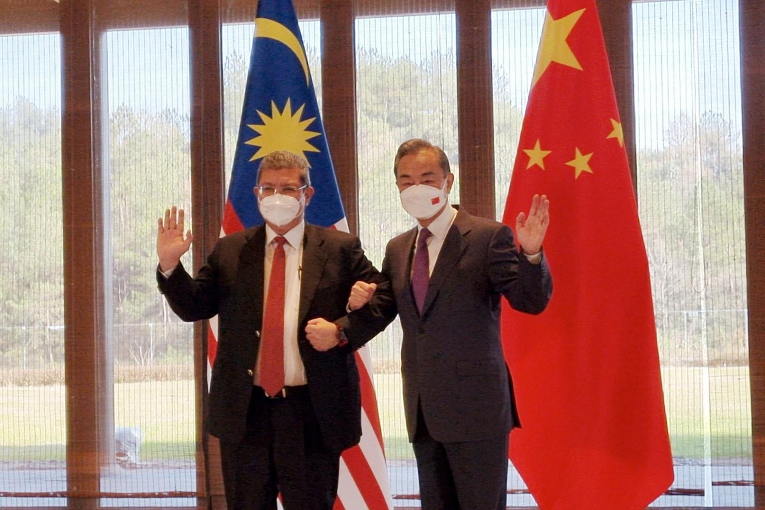 Malaysia's Foreign Minister Datuk Saifuddin Abdullah (left), with his Chinese counterpart Wang Yi in Huzhou, on Dec 5, 2021.