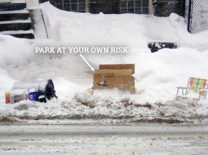 If you shovel your spot, you've earned the right to mark your territory with anything from a beach chair to safety cones to a statue of the Virgin Mary. Whatever you do, don't move our spot-savers, as retaliation comes in the form of street justice (or at least a very pissed off note). It's a time-honored tradition.