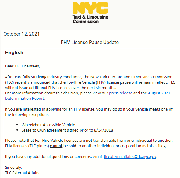SubscribeSign inTLC Confirms "Plate Cap" Extension & Calls Out Illegality of Selling FHV LicensesPreviously announced September decision regarding FHV License Pause extension sent out in official email blast to TLC drivers. TLC makes clear it's illegal to sell an FHV License