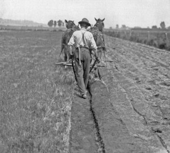 Again, with the 2-bottom plow tilted to the left, lower the plow into the soil at the headland furrow. Drive toward the stake, or other marker at the opposite end of the land. This is where careful layout pays off. Rather than picking out a tree to head for at the far end of the field, use stakes or other good markers. It has been said that novice plowmen have used a neighbor’s cow for a marker only to have the cow wander off.