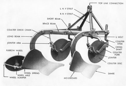 Plow: There are many devices called plows (or ploughs), including snowplows. The subject of this article is the moldboard field plow. The two main types are trailer plows and mounted plows. The main parts of both are the bottoms, coulters, jointers, furrow wheels (or rolling landsides) and beams. The bottoms consist of the moldboard, share, frog and landside, and in some cases, a replaceable shin.