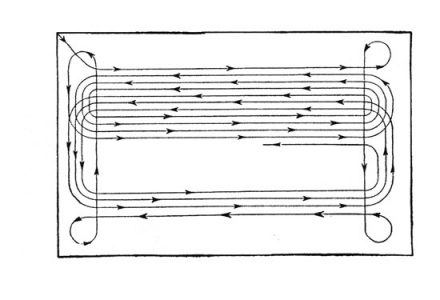 Images 6 and 7 show two optional plowing patterns. Image 7 works best with mounted plows, since tight turns are required in the center of the lands. For trailer plows, the pattern of image 6 allows breaking off from finishing land one to start on the next, and so on with subsequent lands. However it is likely that a tight turn will be required to finish the last land. Thus, more headland room is required with this method.