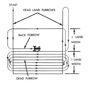 First plow the headland furrow with the plow tilted to the left (assuming a 2-bottom plow), leaving ample room to make the turns. Headland furrows should be turned toward the land to be plowed. These furrows will make it easier for the plow to penetrate at the start and to make an even finish at the end.