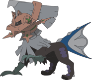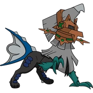 Type: Null is a chimeric-looking quadruped Pokémon combining body parts from several different creatures. Its body is black and catlike, with three-toed paws on its hind legs while its front legs are green and resemble an insect's or bird's. It has purple scales on its upper hips, its tail is a blue forked fin with a gray membrane, and a mane of gray fur hangs around its neck. Its head is mostly obscured by a metallic helmet with a ring resembling that of Arceus around the neck and a silver crest on the top. Its gray eyes are, however, visible through a pair of openings on the helmet.