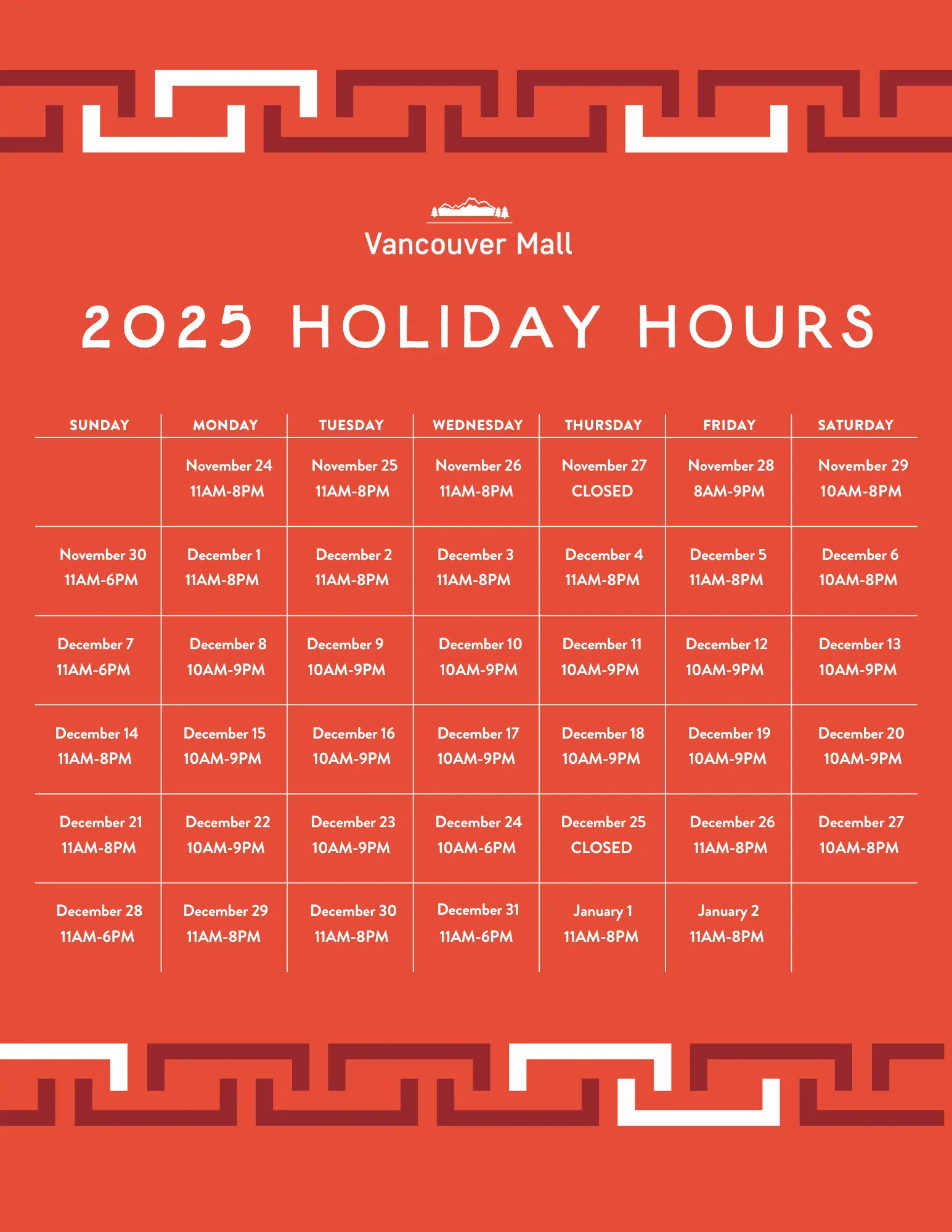 Mall Hours And Special Holiday Hours - Sunridge Mall