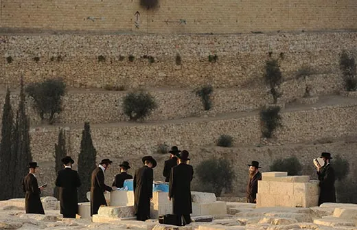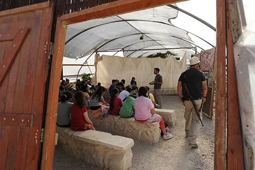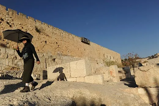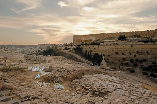 Leading me outside the plastic-covered building, Barkay squints into the sunlight. We can see the Temple Mount in the distance, the sunlight glinting off the golden-topped Dome of the Rock. “We’ve been working for six years, and we’ve gone through 20 percent of the material,” he says, pointing to huge heaps of earth that fill an olive grove below the tent. “We have another 15 to 20 years to go.”