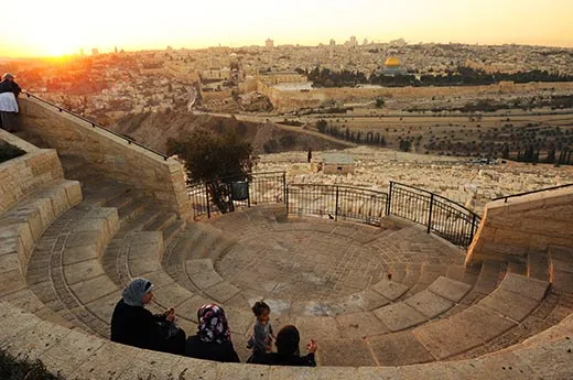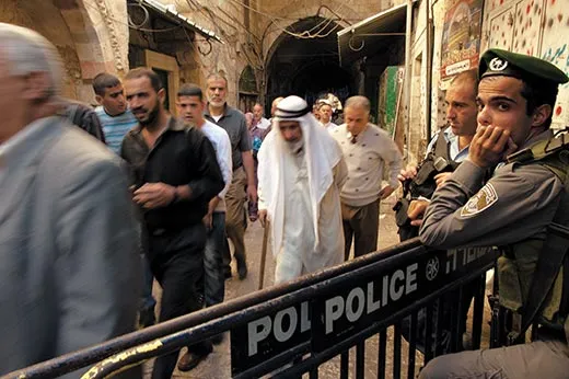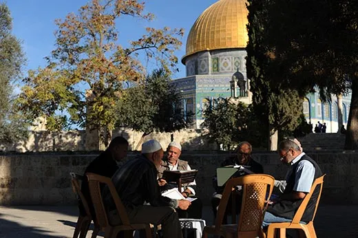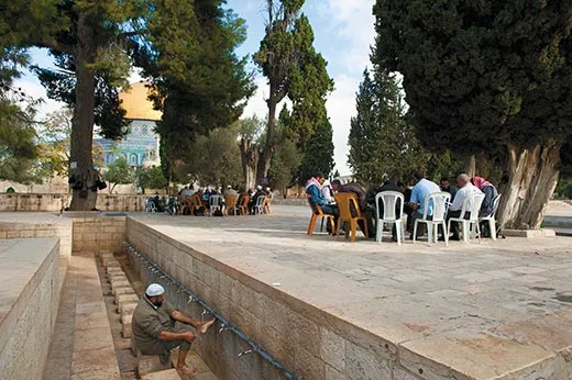 Today, the scene is calm. At various spots on the wide, leafy plaza Palestinian men gather in study groups, reading the Koran. We ascend steps toward the magnificent Dome of the Rock—which was built during the same period as the Al-Aqsa Mosque to the south, between A.D. 685 and 715. The Dome of the Rock is built on top of the Foundation Stone, which is sacred to both Jews and Muslims. According to Jewish tradition, the stone is the “navel of the Earth”—the place where creation began, and the site where Abraham was poised to sacrifice Isaac. For Muslims, the stone marks the place where the Prophet Muhammad ascended to the Divine Presence.