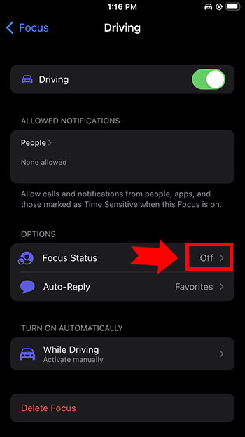 - Tap Focus Status and turn on the feature. Now, whenever you turn this Focus Mode on, those trying to contact you will know you are away.Tip: You might find that Focus Status is already on. This feature is on by default unless you’ve turned it off in the past. In that case, you can still tap it to learn additional information about this feature on the next screen.