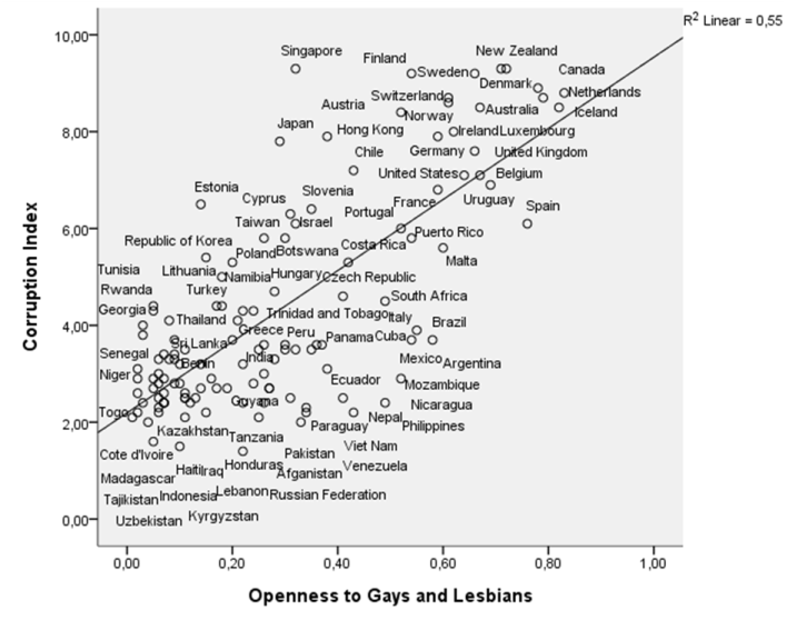 Corruption and Social Tolerance: Corrupt nations also tend to be intolerant places. The CPI is correlated with attitudes toward racial and ethnic minorities (.48) and even more so with attitudes toward gays and lesbians (.74), which the political sociologist Ronald Inglehart of the University of Michigan notes is the last frontier of intolerance across the nations of the world. The above chart shows the relationship between CPI rankings and attitudes toward gays and lesbians.