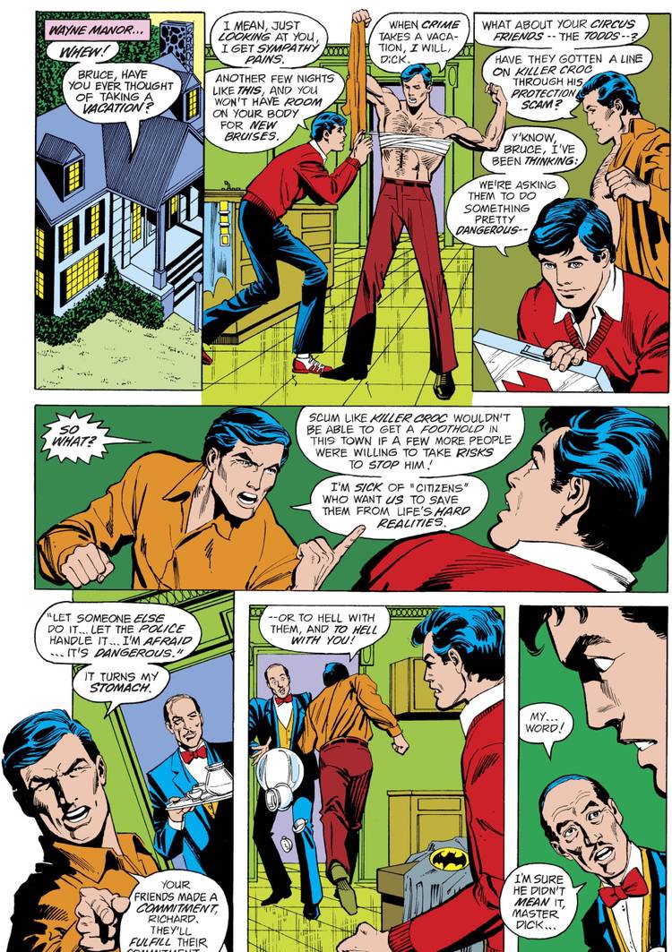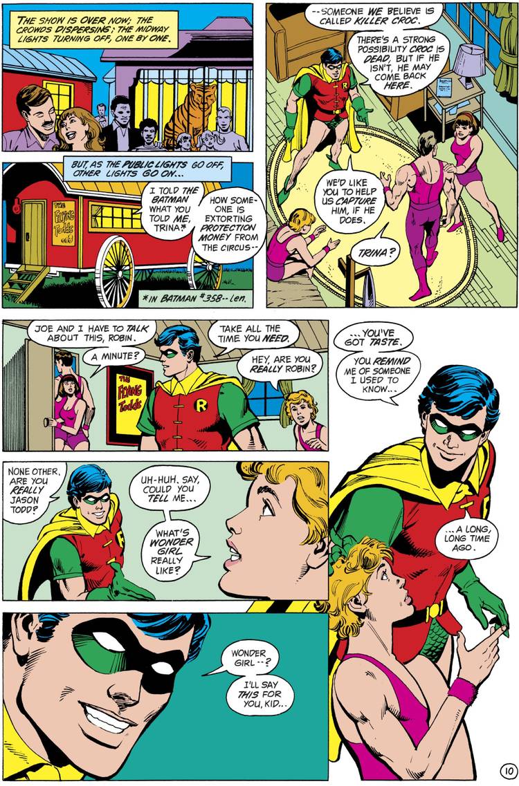In early 1983, a new Batman villain, Killer Croc, was introduced at the tail end of Gerry Conway's run as the writer of both Batman and Detective Comics. Batman was getting obsessed with bringing down the new villain and so Robin visited some aerialists, the Flying Todds, who worked with a circus that Killer Croc was trying to extort and Robin asked the Todds for help with Croc, by stringing the villain along and letting the heroes know when he would be around so that they could bring him down...