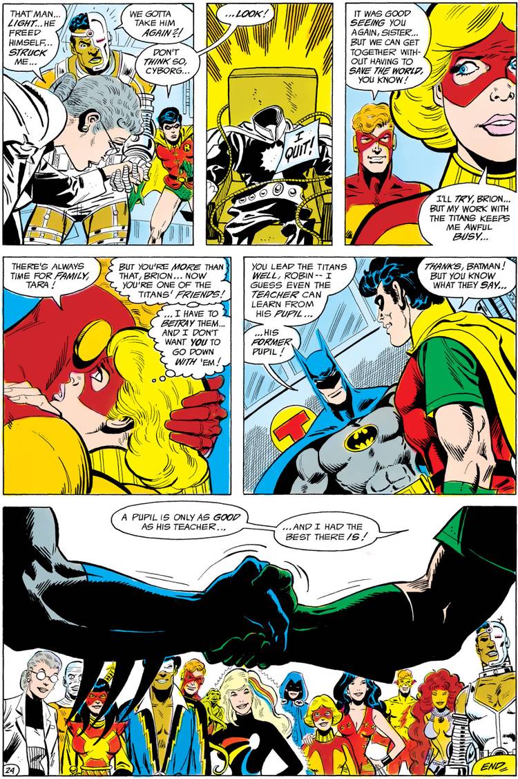 Meanwhile, at the end of 1983, the Teen Titans and the Ousiders had a crossover and in Batman and the Outsiders #5 (by Mike W. Barr, Marv Wolfman and Jim Aparo), Robin is sick of Batman talking down to him throughout the crossover and lets Batman know that he probably knows more about leading a team now than Batman...