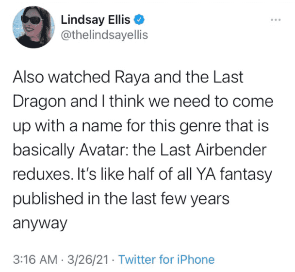 "I can see where if you squint I was implying all Asian-inspired properties are the same, especially if you were already privy to those conversations where I had not seen them. But the basic framework of TLA is becoming popular in fantasy fiction outside of Asian inspired stuff," Ellis tweeted later, possibly in an effort to explain her earlier tweet, which some thought exhibited a lack of "research".