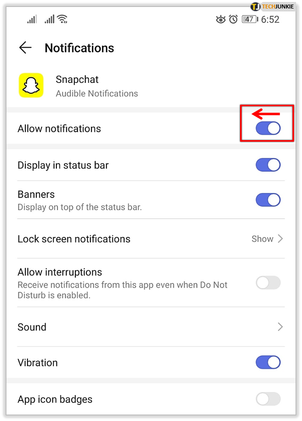 If you are more comfortable with simply turning off all notifications on an iPhone, simply open ‘Settings’ and tap on ‘Notifications.’ From here you can tap on ‘Snapchat’ and customize your notifications. You can turn off the banner that appears at the top if that’s what annoys you while leaving the sound and red icon on.
