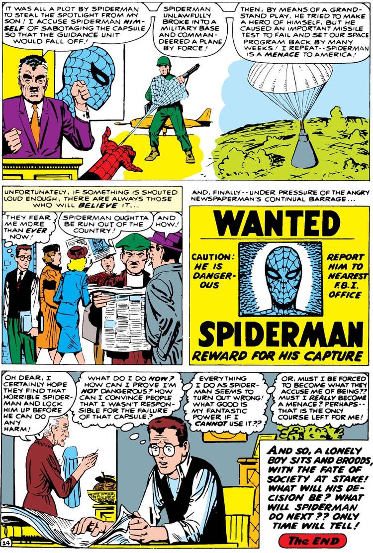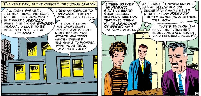 Finally, in Amazing Spider-Man #10, with Steve Ditko now having greater control over the plotting of the series, we get the major explanation for Jamesom's distaste for Spider-Man. It apparently comes down to simple petty jealousy.