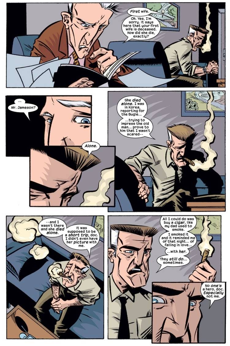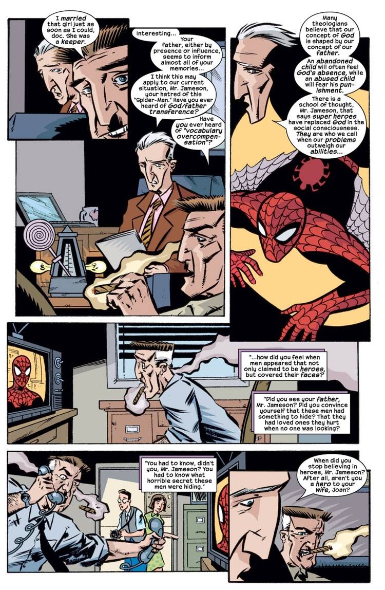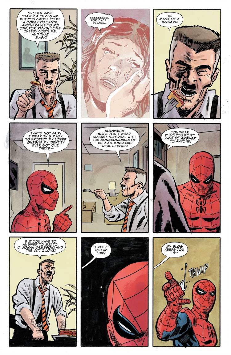 In Spider-Man's Tangled Web #20 (by Zeb Wells and Dean Haspiel), the "mask" motif was a big part of their new take on Jameson. We see Jameson's background and learned that he was raised by a man who was both technically a war hero but also an abusive jerk. Therefore, Jameson associated the "mask" of his father (yes, this leads to a future retcon, which will be detailed in a forthcoming article) of pretending to be a hero while being a jerk in private to something that he associates with Spider-Man. Spidey pretends to be a hero, but Jameson suspects something behind that mask...