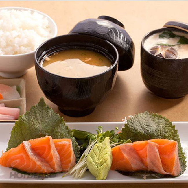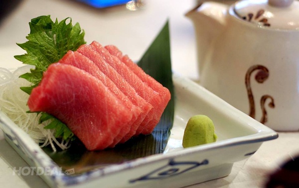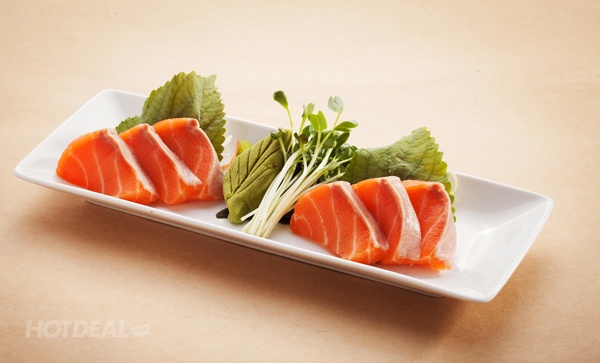 Bên cạnh sushi, sashimi cũng là một cái tên có truyền thống lâu đời ở xứ sở hoa anh đào. Sashimi là những miếng hải sản tươi sống thường được cắt thành từng lát mỏng, ăn kèm với cơm dấm, cùng các loại nước chấm như xì dầu, tương, các loại gia vị như mù tạt, gừng, lá tía tô và củ cải trắng thái chỉ. Góp mặt trong 2 set ăn kể trên chính là sashimi cá ngừ và sashimi cá hồi. Khi thưởng thức, vị cay nồng từ mù tạt sẽ đánh thức tất cả các giác quan của bạn. Kế đến là vị mằn mặn của nước tương hảo hạng và vị ngọt tươi ngon, béo mà thanh của cá sống. Tất cả cùng hòa trộn với nhau một cách ăn ý, hoàn hảo, và tan dần trong miệng người dùng.