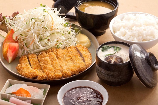 1. Ton katsu age lunch set: thịt heo chiên xù, trứng hấp tôm, cơm, súp miso, xà lách, đồ chua