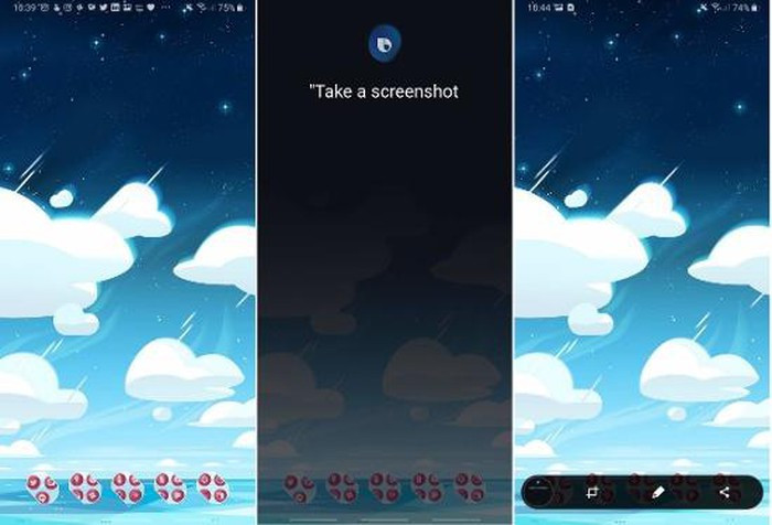 - Mở ứng dụng hoặc trang web muốn chụp, nhấn và giữ nút Bixby hoặc nói "Hey Bixby" sau đó chỉ cần đọc lệnh "Take a screenshot" là xong. Màn hình sẽ nhấp nháy để báo ảnh đã chụp và thanh công cụ chụp màn hình sẽ xuất hiện để bạn thao tác giống như cách 1.
