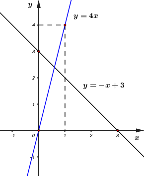 1. Vẽ hai đồ thị hàm số \(y = - x + 3\) và \(y = 4x\)