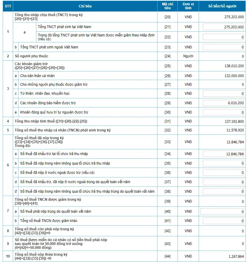 [32] Tổng số thuế thu nhập cá nhân (TNCN) phát sinh trong kỳ: Số thuế chính xác phải nộp cho tổng thu nhập phát sinh trong năm 2021.