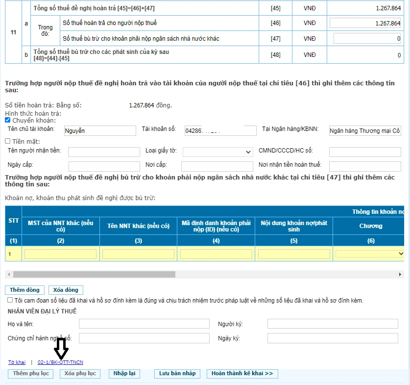 Trường hợp không muốn hoàn tiền mà muộn bù trừ cho các khoản phải nộp ngân sách nhà nước khác thì nhập con số tại mục [48] vào mục [47].