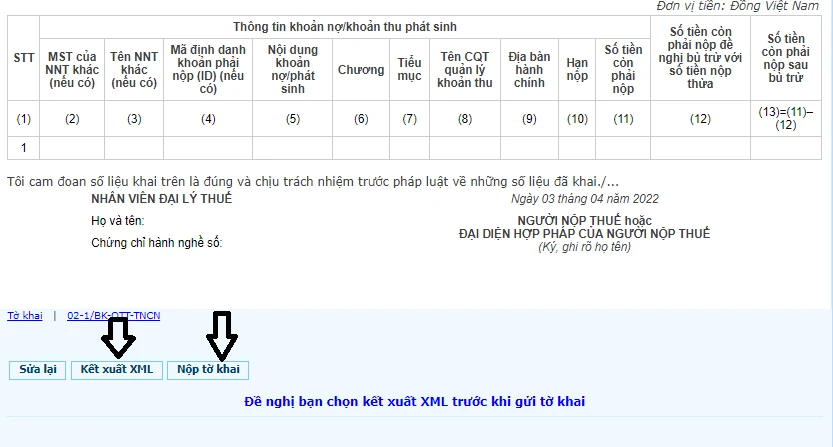 Sau khi chọn “kết xuất XML’, hệ thống sẽ gửi về người kê khai file tờ khai theo định dạng XML. Sử dụng máy tính có cài itax viewer để mở file tờ khai theo định dạng XML>> In >> Ký tên người khai thuế.