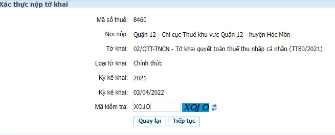 Bước 8:Chọn Nộp tờ khai, nhập mã kiểm tra để xác thực nộp tờ khai và chọn Tiếp tục.