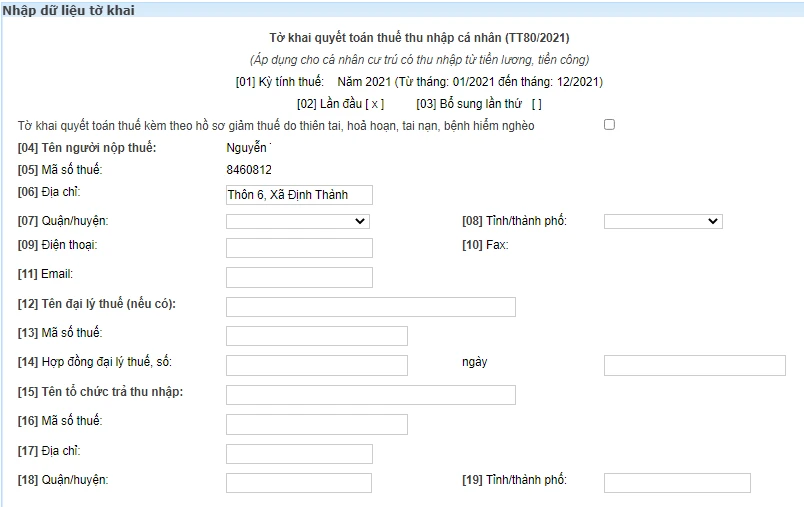 - Loại tờ khai, năm kê khai: Hệ thống tự động nhập là Tờ khai chính thức, năm quyết toán 2021 (tức quyết toán với những khoản thu nhập phát sinh trong năm 2021).
