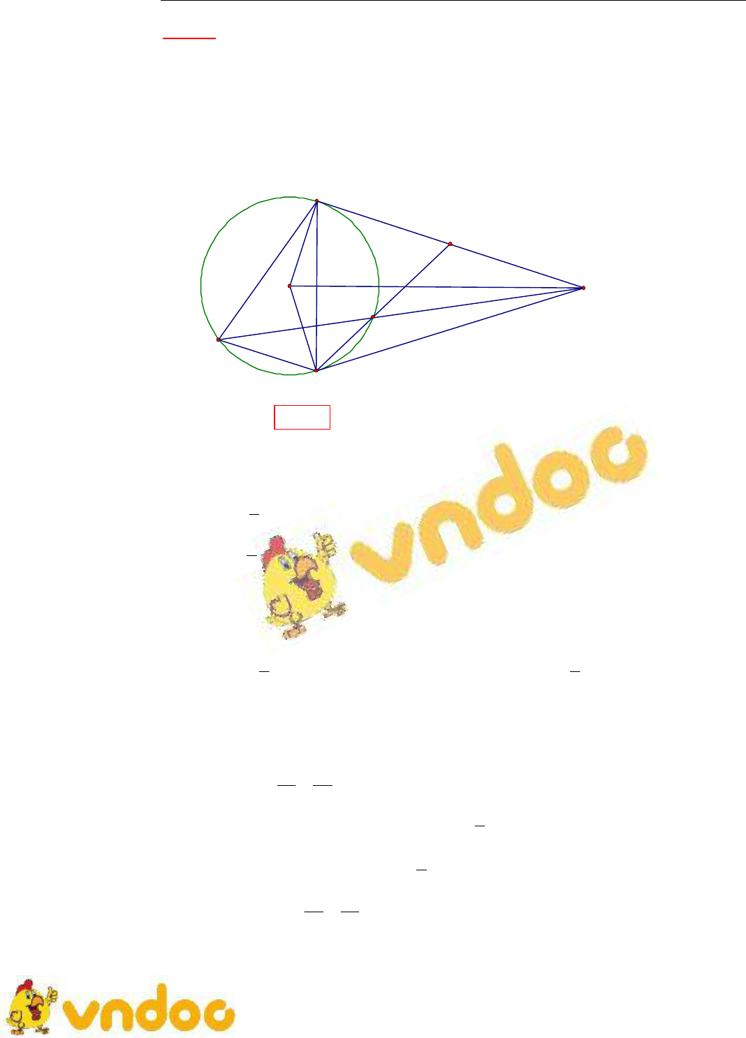 1Baøi 51:Cho (O), töø moät ñieåm A naèm ngoaøi ñöôøng troøn (O), veõ hai tt AB vaø AC vôùi ñöôøng troøn. Keû daây CD//AB. Noái AD caét ñöôøng troøn (O) taïi E. 1.C/m ABOC noäi tieáp. 2.Chöùng toû AB2=AE.AD. 3.C/m goùc AOCACBvaø BDC caân. 4.CE keùo daøi caét AB ôû I. C/m IA=IB. 1/C/m: ABOC nt:(HS töï c/m) 2/C/m: AB2=AE.AD. Chöùng minh ADB ∽ ABE , vì coù E chung. Sñ ABE=21sñ cung BE (goùc giöõa tt vaø 1 daây) Sñ BDE=21sñ BE (goùc nt chaén BE) 3/C/m AOCACB * Do ABOC nt AOCABC (cuøng chaén cung AC); vì AC = AB (t/c 2 tt caét nhau) ABC caân ôû AABCACBAOCACB* sñ ACB=21sñ BEC (goùc giöõa tt vaø 1 daây); sñ BDC =21sñ BEC (goùc nt) BDC=ACB maø ABC=BDC (do CD//AB) BDCBCD BDC caân ôû B. 4/ Ta coù I chung; IBEECB (goùc giöõa tt vaø 1 daây; goùc nt chaén cung BE)IBE∽ICBICIBIBIE IB2=IE.IC Xeùt 2 IAE vaø ICA coù I chung; sñ IAE =21sñ (DBBE) maø BDC caân ôû BDBBCsñ IAE=1sñ (BC-BE) = sñ CE= sñ ECA2 IAE∽ICAIAIEICIAIA2=IE.IC Töø vaøIA2=IB2 IA=IB Hình 51 IEDCBOA
