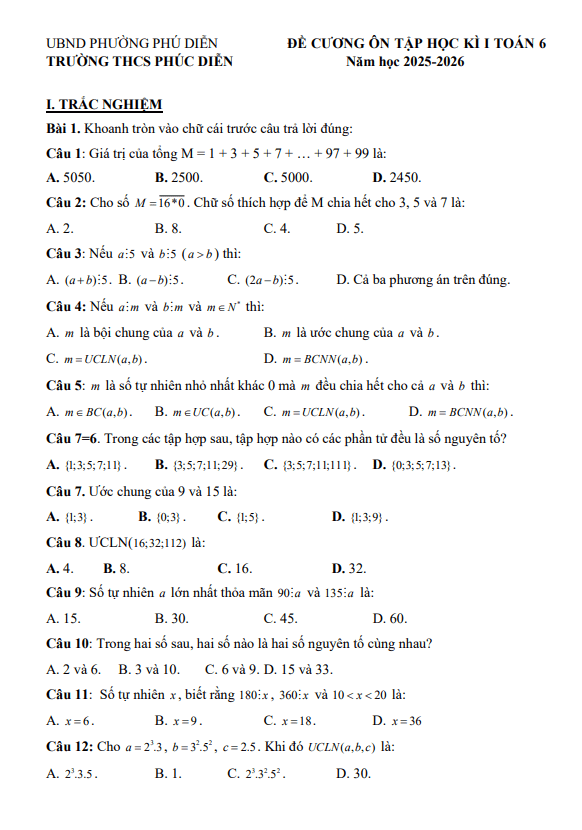 Đề cương học kì 1 Toán 6 năm 2025 – 2026 trường THCS Phúc Diễn – Hà Nội 16/12/2025