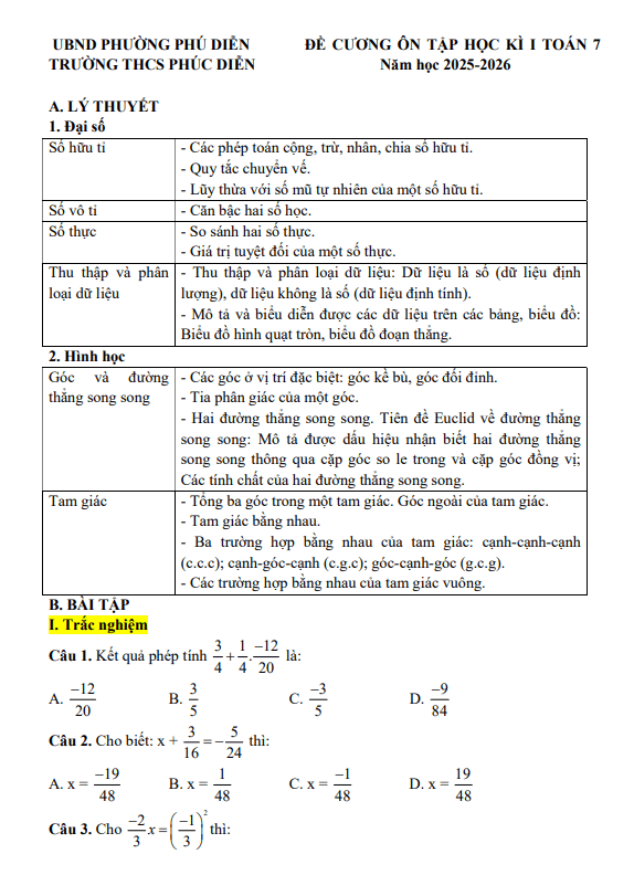 Đề cương học kì 1 Toán 7 năm 2025 – 2026 trường THCS Phúc Diễn – Hà Nội 16/12/2025