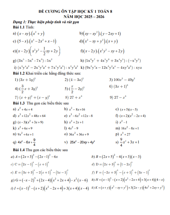 Đề cương học kì 1 Toán 8 năm 2025 – 2026 trường THCS Phúc Diễn – Hà Nội 16/12/2025