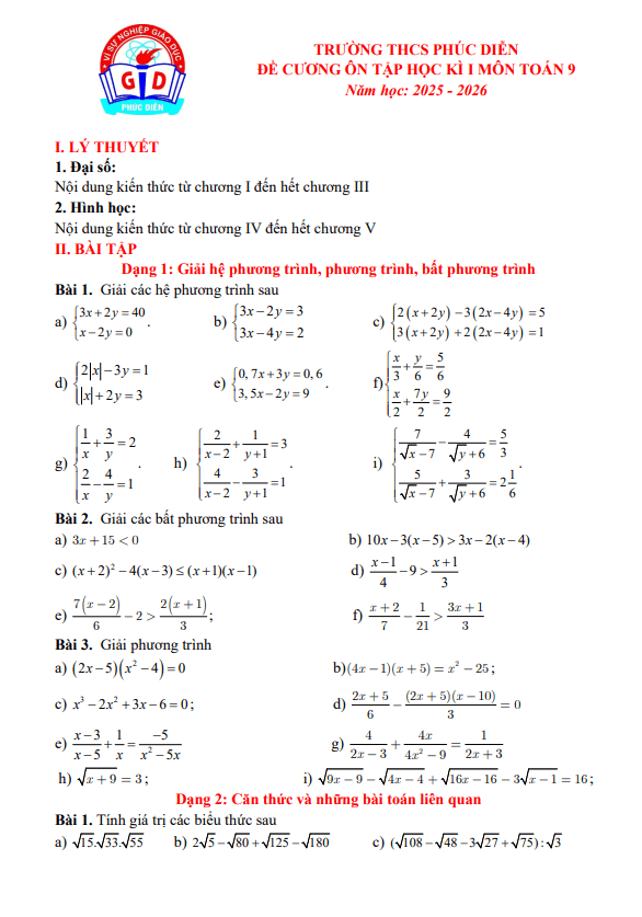 Đề cương học kì 1 Toán 9 năm 2025 – 2026 trường THCS Phúc Diễn – Hà Nội 16/12/2025