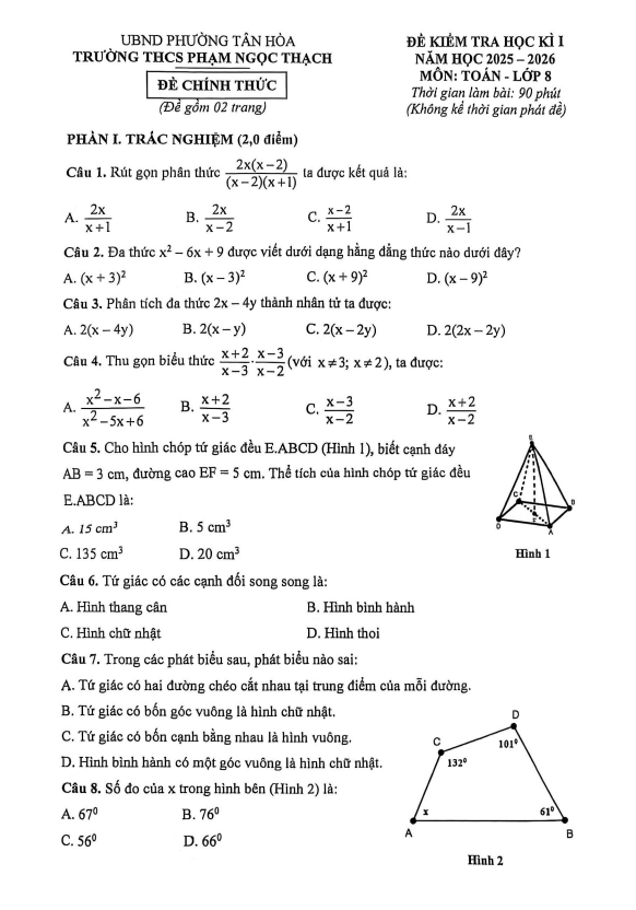 Đề học kì 1 Toán 8 năm 2025 – 2026 trường THCS Phạm Ngọc Thạch – TP HCM 20/12/2025
