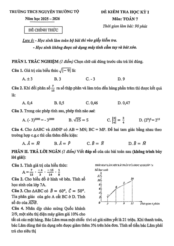 Đề học kỳ 1 Toán 7 năm 2025 – 2026 trường THCS Nguyễn Trường Tộ – Hà Nội 20/12/2025