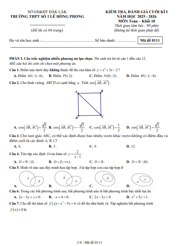 Đề cuối kì 1 Toán 10 năm 2025 – 2026 trường THPT Lê Hồng Phong 1 – Đắk Lắk 10/01/2026
