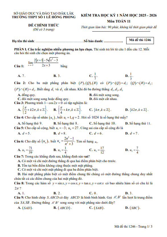 Đề cuối kì 1 Toán 11 năm 2025 – 2026 trường THPT Lê Hồng Phong 1 – Đắk Lắk 10/01/2026