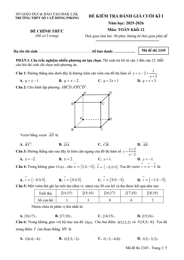 Đề cuối kì 1 Toán 12 năm 2025 – 2026 trường THPT Lê Hồng Phong 1 – Đắk Lắk 10/01/2026