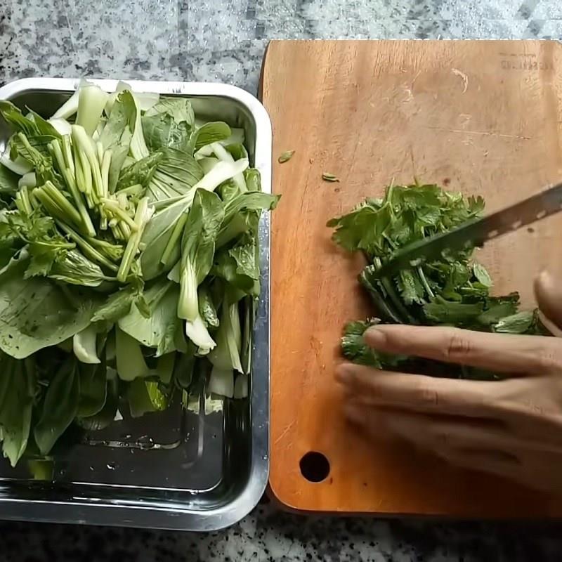 Hành lá, ngò rí cần tây bạn cắt bỏ gốc rễ, rửa sạch. Hành lá bạn cắt nhỏ, cần tây bạn cắt khúc khoảng 1 lóng tay để riêng phần cọng cứng và lá cần tây.