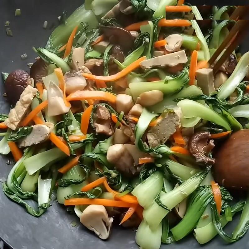 Hủ tiếu tươi 350 gr(hoặc hủ tiếu khô) Chả chay 100 gr(hoặc mì căn) Cà rốt 1 củ Cải thìa 200 gr Nấm rơm tươi 250 gr Nấm mèo khô 100 gr Nấm đông cô tươi 200 gr(nấm hương) Hành lá 5 nhánh Ngò rí 5 nhánh Cần tây 5 nhánh Tắc 3 trái Ớt 2 quả Nước tương 4 muỗng canh Dầu hào 1 muỗng canh Dầu ăn 1 muỗng canh Gia vị thông dụng 1 ít(Muối/ đường/ hạt nêm/ tiêu xay)