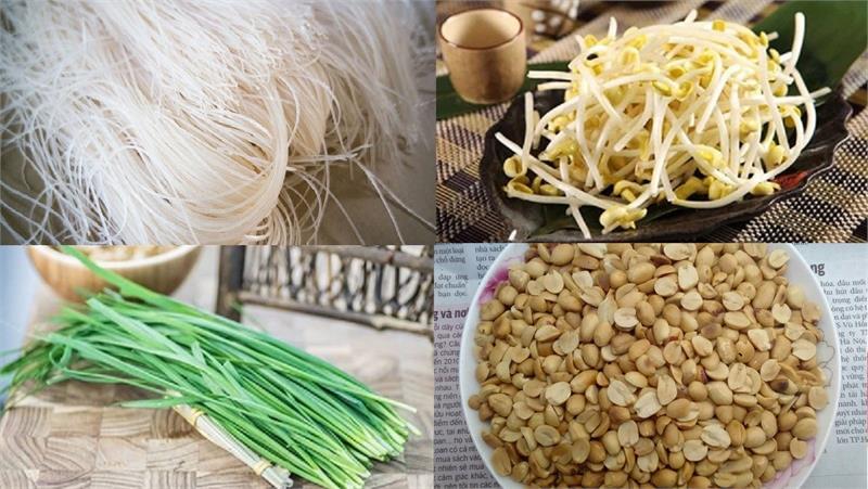 Hủ tiếu khô 500 gr Giá đỗ 700 gr Hẹ 200 gr Đậu phộng rang 50 gr Chanh 1/2 trái Ớt 2 quả Nước màu 1 muỗng canh Dầu ăn 4 muỗng canh Nước mắm 4 muỗng canh Muối/ đường 1 ít