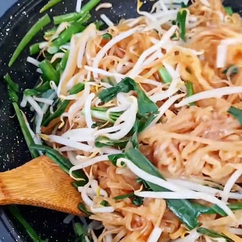 Tiếp đó bạn cho phần giá, hẹ đã sơ chế vào xào thêm 2 phút, nếm nếm cho vừa ăn rồi tắt bếp.