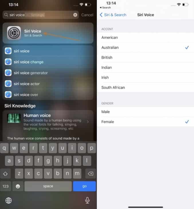 Nếu cảm thấy nhàm chán với giọng nói mặc định, bạn có thể đổi giọng cho Siri. Mở Tìm kiếm tiêu điểm và nhập “Siri Voice” và bạn có thể chọn giữa giọng Mỹ, Úc, Anh, Ấn Độ, Ailen và Nam Phi, cũng như giọng nam hoặc nữ.