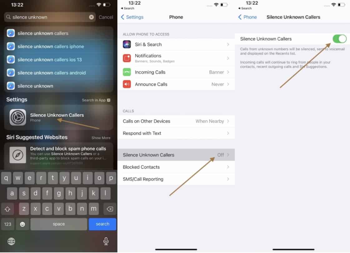 Tiếp theo, nếu bạn nhận được nhiều cuộc gọi khó chịu từ những người gọi không xác định, bạn có thể dễ dàng dừng việc đó. Mở Tìm kiếm nổi bật và gõ Im lặng người gọi không xác định, bật công tắc lên thì bạn sẽ không bị làm phiền nữa.