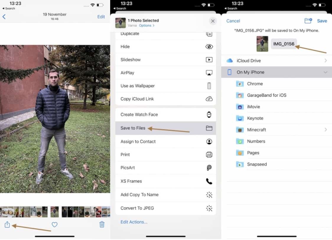 Ứng dụng quản lý tệp này cung cấp cho bạn rất nhiều thông tin. Ví dụ: trong ứng dụng Ảnh, bạn không thể thấy tên của tệp hoặc video. Một mẹo đơn giản để xem đó là mở nó, sau đó chạm vào Chia sẻ và chọn Lưu vào Tệp, và bạn sẽ thấy tên và định dạng.
