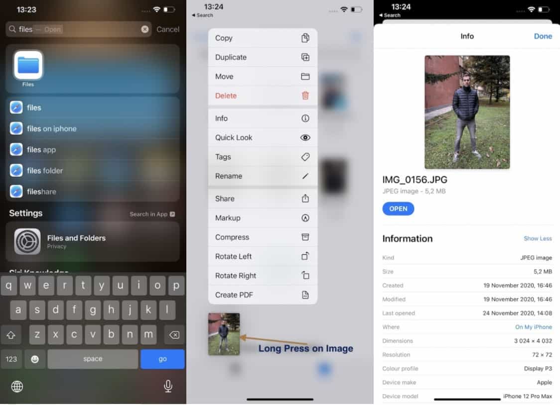 Khi ở trong ứng dụng Tệp, hãy nhấn và giữ một tệp và bạn đã có một loạt cài đặt. Đối với ảnh, chạm vào Thông tin để đọc toàn bộ Exif, bạn có thể xem hình ảnh được tạo khi nào, khi nó được sửa đổi, lần mở gần đây nhất, kiểu máy được chụp, khẩu độ, ISO, mọi thứ.