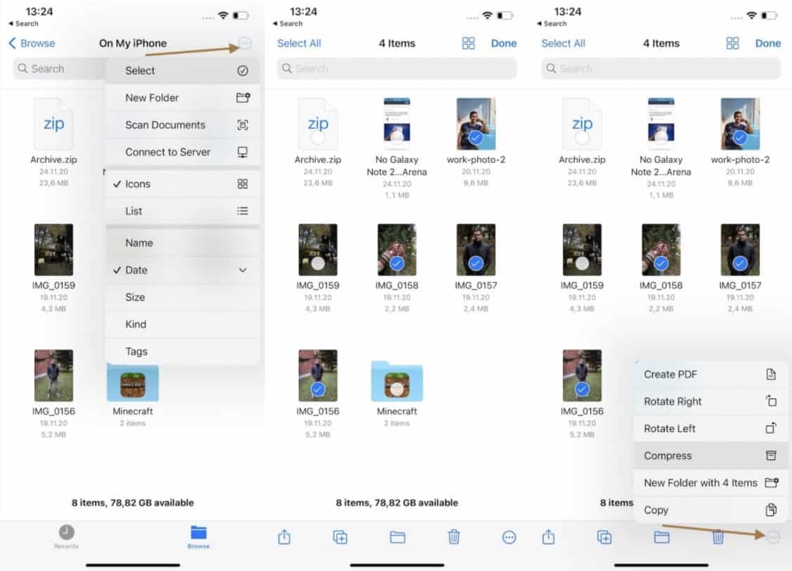 Bạn cũng có thể sử dụng ứng dụng Tệp để nén nhiều tệp vào một kho lưu trữ để dễ dàng chia sẻ. Nhấn vào nút dấu chấm ở góc trên bên phải và chọn nhiều tệp, bây giờ hãy nhấn vào nút dấu chấm ở góc dưới cùng bên phải và chọn Nén. Một tệp lưu trữ ZIP mới sẽ được tạo để bạn có thể dễ dàng chia sẻ với những người khác. Bạn có thể xem các tệp của mình dưới dạng danh sách và bạn cũng có thể dễ dàng sắp xếp chúng theo loại, tên hoặc kích thước.