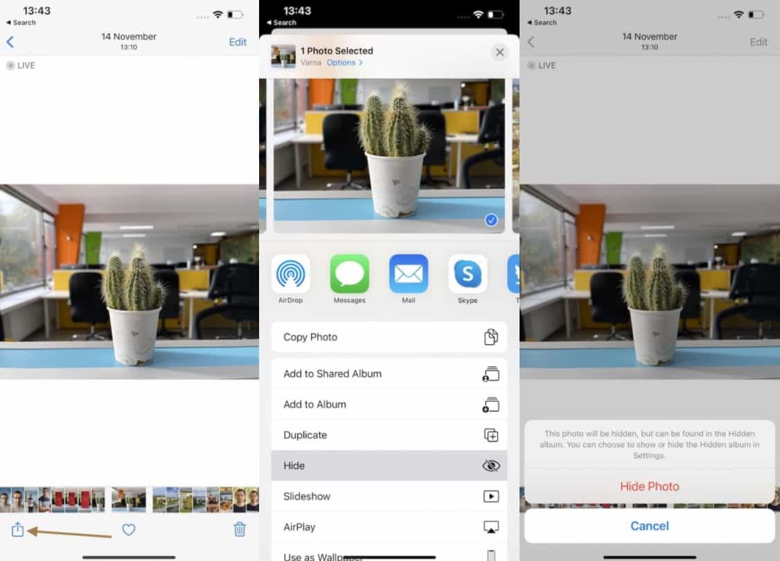 Bạn có biết rằng bạn có thể ẩn ảnh khỏi thư viện ảnh không? Chỉ cần chọn một vài trong số những bức ảnh bí mật của bạn, chạm vào chia sẻ và chọn Ẩn, sau đó chúng sẽ biến mất khỏi thư viện ảnh của bạn. Chúng không được bảo vệ bằng mật khẩu nhưng bạn chỉ có thể nhìn thấy chúng nếu bạn vào tab Album và cuộn xuống thư mục Ẩn, và đó là nơi chúng ở.