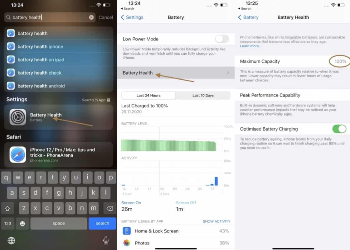 Cuối cùng, về chủ đề pin, hãy mở tìm kiếm nổi bật và nhập pin, sau đó chuyển đến Tình trạng pin. Đây là một phần dữ liệu mà chỉ iPhone cung cấp cho bạn và dữ liệu này không có trên Android. Những chiếc iPhone mới sẽ hiển thị 100%, nhưng khi bạn sử dụng điện thoại trong vài tháng, phần trăm sẽ giảm xuống. Điều này cho thấy sự chai của pin iPhone và khi pin đạt khoảng 80%, điện thoại có thể chạy chậm lại và bạn nên thay pin mới.